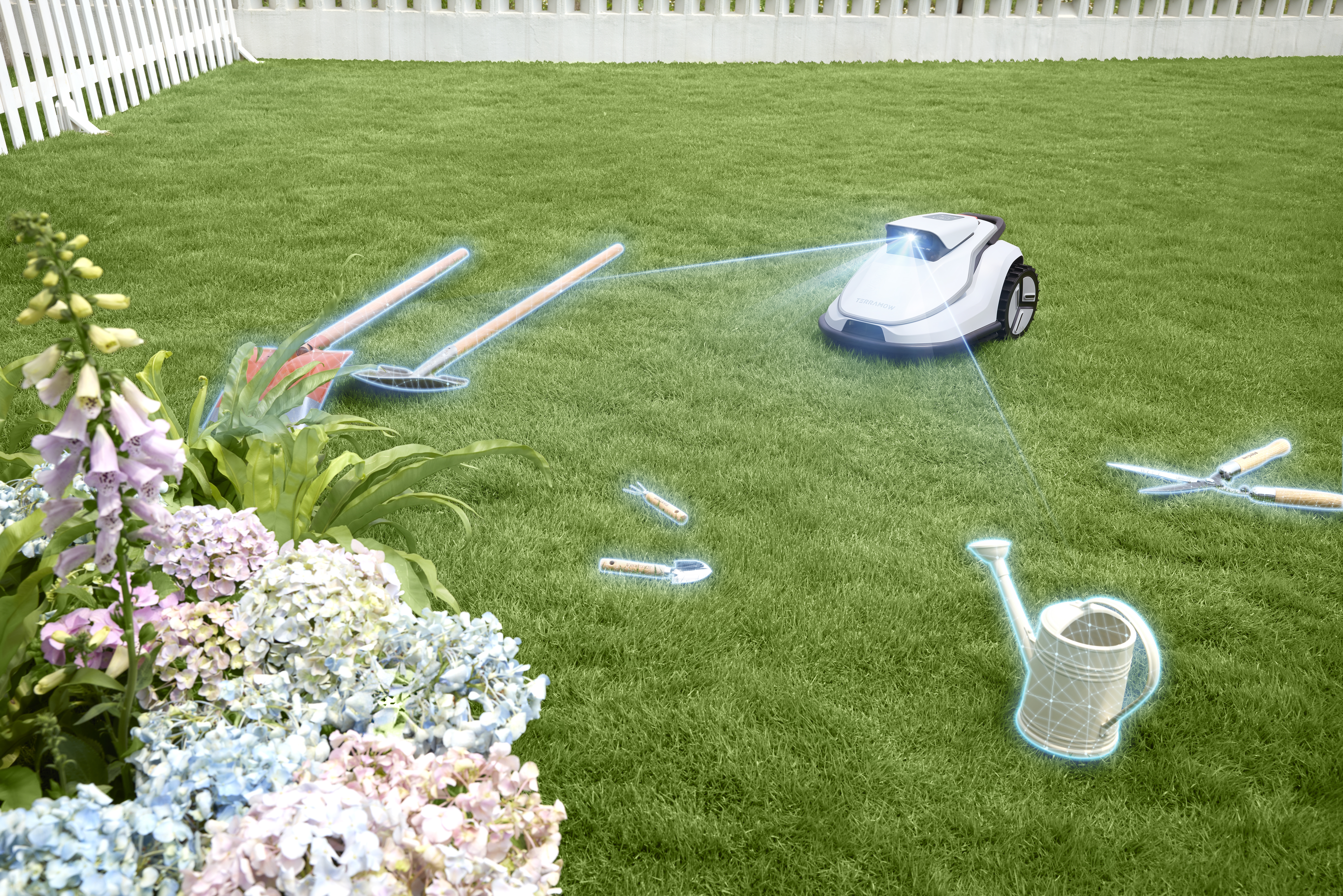 Met een geavanceerd systeem van drie HD-camera’s kan de robot de omgeving analyseren en de maairoute aanpassen aan het terrein.